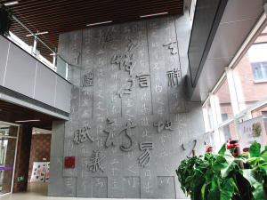 大楼内,一堵透着浓浓“中国味”的文化墙吸引着学子们的目光。据文化墙设计团队负责人胡露露介绍,为了设计这堵文化墙,团队查阅了大量文献,把浮雕的100多个字逐个从书法家的碑帖、作品中找出。在文化墙的制作过程中,团队成员多次前往津南校区,进行实地测量和监工,并充分与学院师生讨论修改,最终完成这一作品。