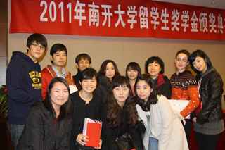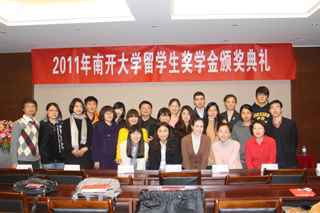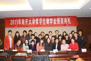 11月18日,爱大会馆H201多功能厅充满欢声笑语,“2011年南开大学留学生奖学金颁奖典礼”在此举行,副校长关乃佳与王立新院长,以及教务处、研究生院、国际学术交流处等各部门领导一同为获奖学生颁奖。