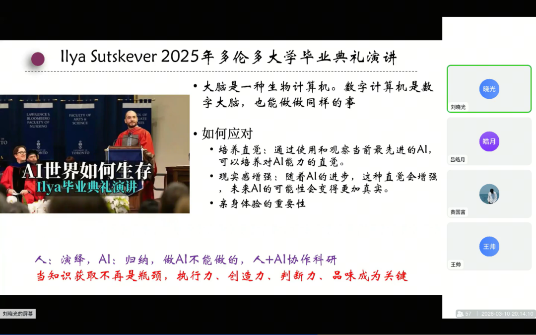 结合AI时代的发展趋势,刘晓光教授分析了行业就业与职业发展的核心逻辑。他表示,AI对标准化、初级白领岗位及流水线工作冲击较大,而个性化体力劳动、高门槛的专家型岗位则具备更强的抗替代性;AI是专家能力的放大器,可能会替代基础的辅助性工作。他提出,AI时代的代表性职业将向创业者和科学家靠拢,其核心原因在于AI大幅降低了创新创业和科研的门槛。而真正的创新与科研工作,作为掌握真理的少数人所从事的领域,是AI无法真正替代的。他建议大家在未来的专业和研究方向选择上,以“做到最好”为核心原则,要通过多实践找到自己的优势领域,同时注重终身学习,培养跨界能力、创造力和批判性思维。