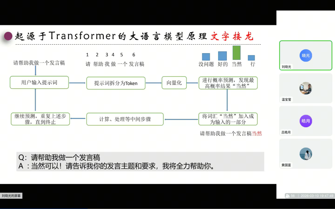 讲座中,刘晓光教授首先以科普的视角,从AI大模型的底层逻辑出发,为老师与同学们搭建起人工智能与语言学的沟通桥梁。他以维特根斯坦“语言即世界”的观点为切入点,指出人类的知识体系本质是语言,而AI通过学习人类语言间接认识世界,这也是大语言模型与语言学深度关联的核心原因。在回顾人工智能发展历程时,刘晓光教授梳理了从图灵机、图灵测试的提出,到达特茅斯会议确立“人工智能”概念,再到机器学习、深度学习发展的全脉络,解析了人工智能三次发展高峰与两次低谷的背后原因,重点介绍了2024年诺贝尔物理学奖得主在深度学习领域的贡献。