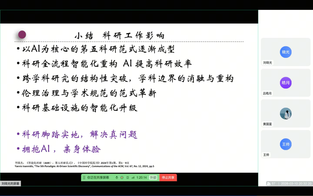 在人工智能与语言学融合的板块,刘晓光教授提出,“人+AI”的协同科研范式已成为不可逆的第五科研范式,AI已渗透到文献检索、实验设计、数据处理、论文写作等科研全流程。他提到了AI在实验语音学领域的应用场景,包括数据采集与处理、语音信号分析、特征提取、语音合成优化等,同时也指出了AI在小样本、高专业性领域(如甲骨文生僻字识别)的应用局限。此外,他特别强调了科研诚信问题,提醒师生警惕AI在论文写作、图片生成等环节中带来的学术不端风险,指出当前AI检测工具的局限性,呼吁大家脚踏实地,以创新创意彰显科研价值。