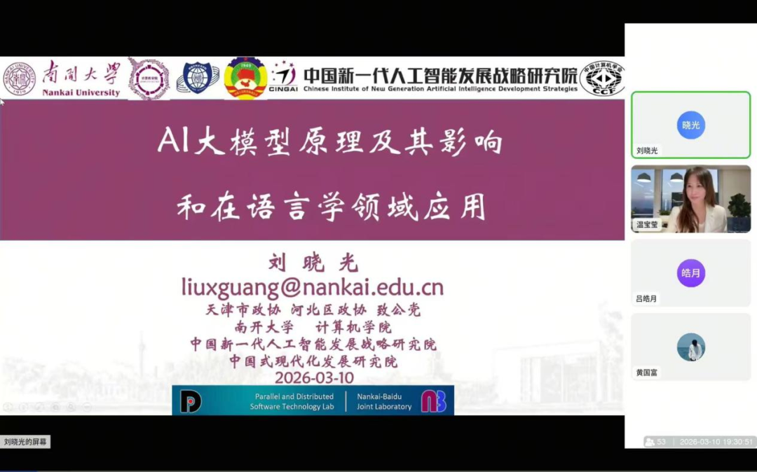 本学期首场研究生学术前沿讲座顺利举办。本次讲座以“AI大模型原理及其影响和在语言学领域的应用”为主题,特别邀请南开大学计算机学院副院长、人工智能领域资深专家刘晓光教授担任主讲人。国际教育学院和皇冠网址